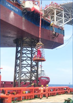 Ảnh: Các cán bộ kỹ thuật SEAMAP trên giỏ chuyên dụng vận chuyển người ngoài khơi đang được kéo lên giàn khoan Tam Đảo 03 trong hoạt động dịch vụ dầu khí năm 2025