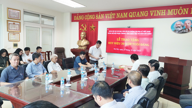 Sáng ngày 15 tháng 10 năm 2025, Đảng bộ Bộ phận Trung tâm Trắc địa và Bản đồ biển đã long trọng tổ chức Lễ trao Huy hiệu 30 năm tuổi Đảng cho hai đồng chí Phùng Tiến Nam và đồng chí Tăng Quốc Cương.